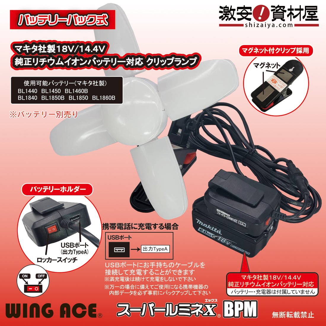 [マキタ互換]バッテリーパック式 LED電球付屋内用クリップランプ スーパールミネX BPM SLX-3000BPM (バッテリー・充電器付属無し) WING ACE LED作業灯 マキタ社製バッテリー使用可能